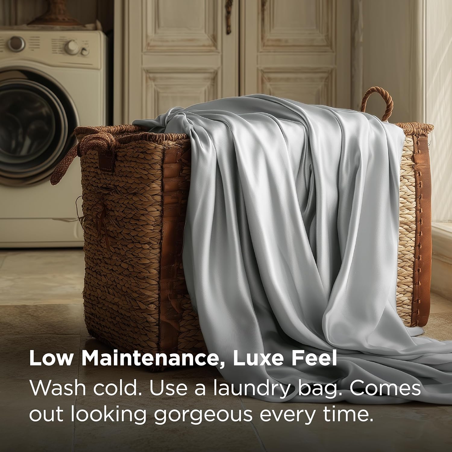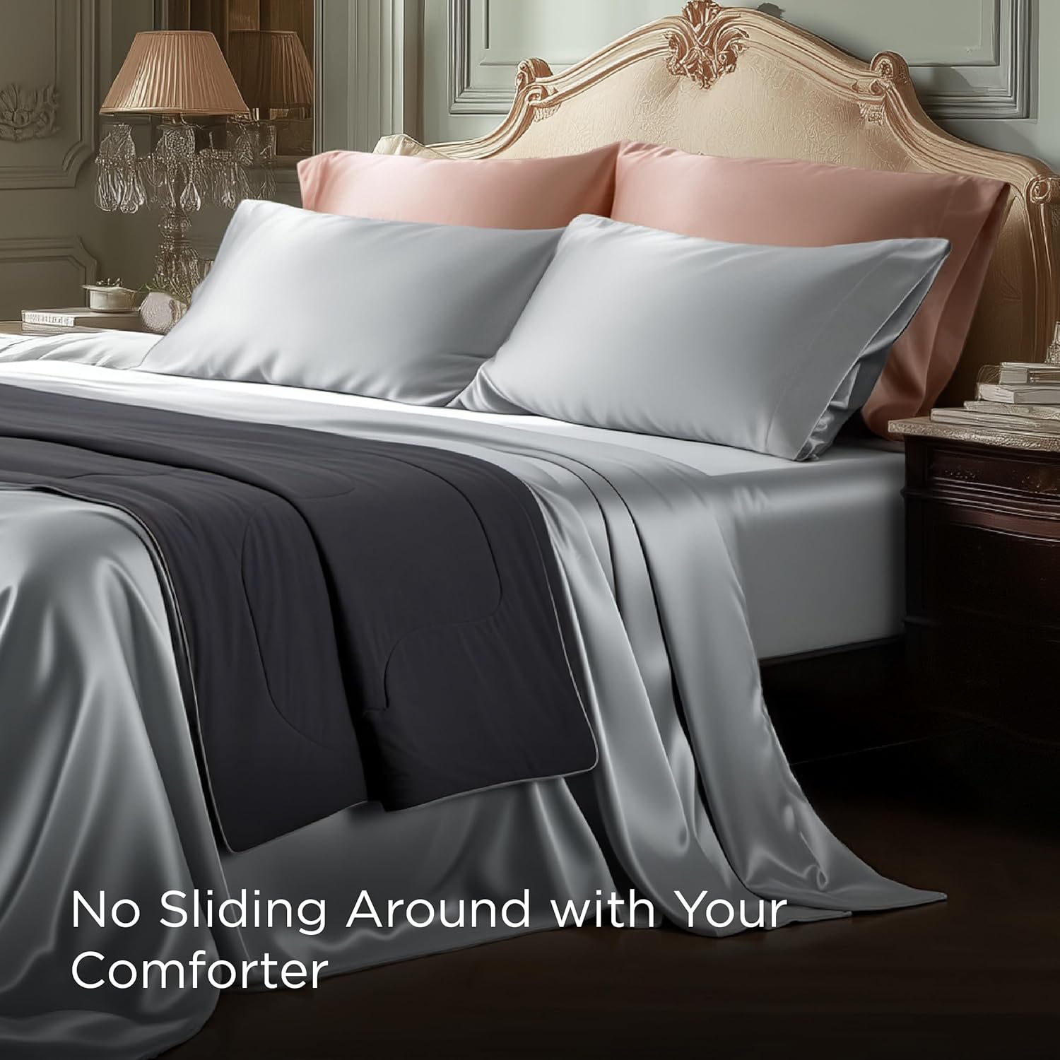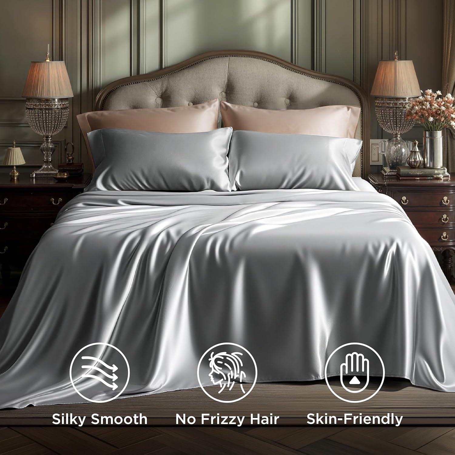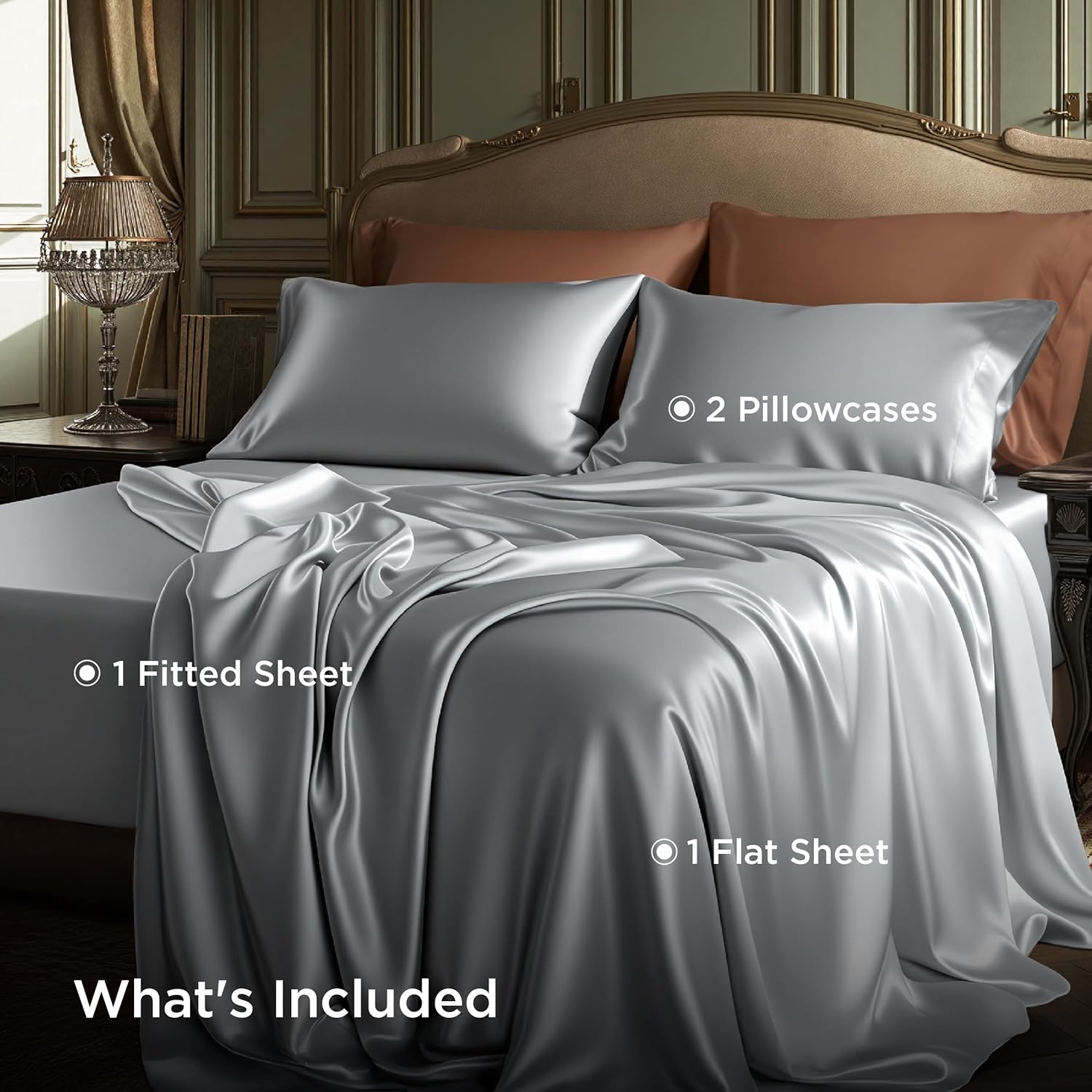 Elevate your sleeping experience with the Bedsure Satin Sheets Queen Size Bed Set, designed to offer a luxurious, silky touch to your bedding. This 4-piece set in elegant Silver Grey combines beauty with functionality, ensuring your bed looks as good as it feels.